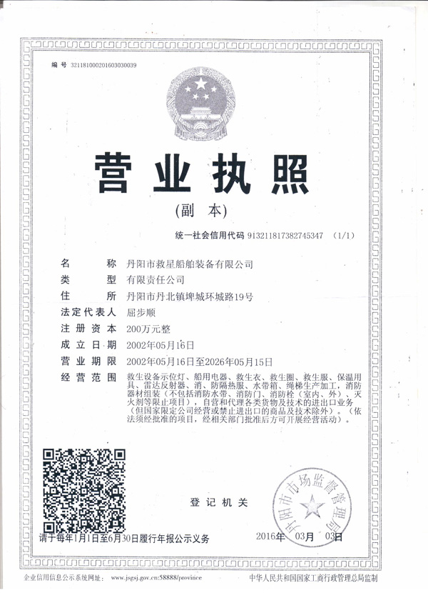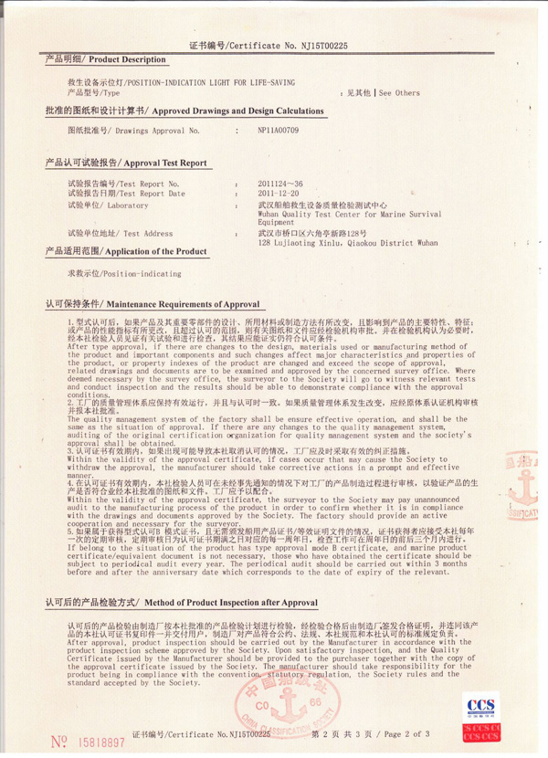 丹陽市救星船舶裝備有限公司為丹陽市船舶救生照明設備廠子公司,主要生產(chǎn)救生設備示位燈、雷達反射器、引航員軟梯、登乘梯等產(chǎn)品。其中救生設備示位燈采用國際上最先進的科學技術、生產(chǎn)工藝,優(yōu)質(zhì)材料制造,各項技術指標超過國際先進水平,完全滿足國際最新標準。2012年元月取得“CCS”型式認可證書,并具有歐共體“EC”證書。另外本公司制造的RDF400雷達反射器還獲得了實用新型專利。